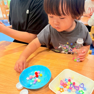 自分たちで作った物を手に取ると、「すご~い♡」「きらきら~☆」と目を輝かせながら、上下に振ってみたり、コロコロ転がしたり、楽しそうに遊んでいました🎵
