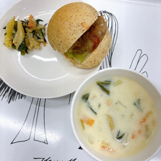 今日のメニューは、ハンバーガー・にぎやかサラダ・クリームスープ☆