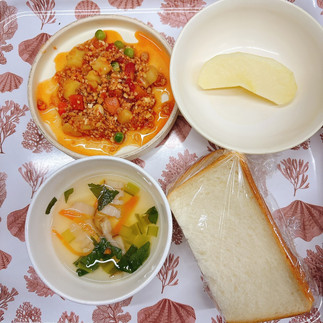 今日のメニューは、食パン・ポークビーンズ煮・コンソメスープ・りんご☆